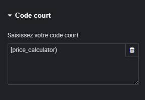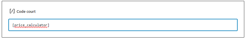 Rien de plus simple pour l’intégration, il vous suffit de copier coller le shortcode « [price_calculator] » dans la page que vous souhaitez dans un bloc HTML. Que vous utilisiez Gutenberg, Elementor ou un autre éditeur de page, vous pouvez intégrer un shortcode wordpress. Si vous ne trouvez pas, renseignez-vous auprès de votre plugin d’édition de page.